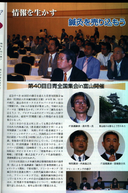 | 2003年10月号 医道の日本誌日本鍼灸師会青年部全国集会 『情報を生かす-鍼灸を売り込もう-』院長の講演が紹介される Click!拡大!! | ||